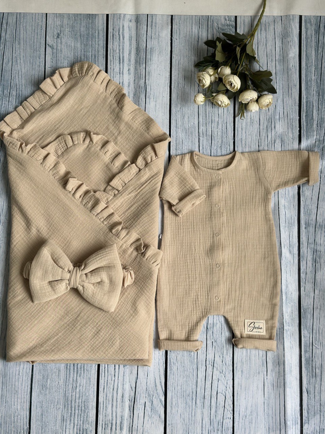 Теги: Купить детские конверты, комбинезон оптом, детские конверты на выписку оптом. 335-К. Комплект из детского комбинезона, р 56 и конверта муслин, хлопок 100% 90/90 см, кофейный цена,отзывы официальный сайт "Стеша Выборг"