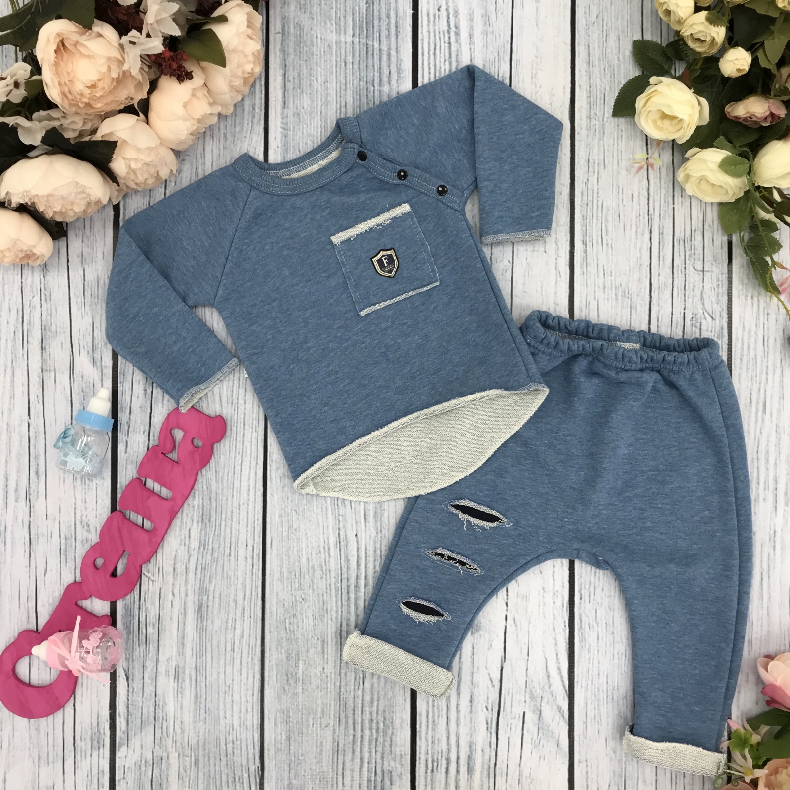 Купить оптом 239. Костюм ясельный, хлопок 65%, 35% ПЭ, 3-х нитка футер без начеса, джинса 74,80,86 в Выборге